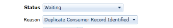 1. When Coastline finds that a duplicate record has been created, they will change the Status of the Activity & Referral record in SAMS to Waiting, with the Reason of Duplicate Consumer Record Identified, as shown below.